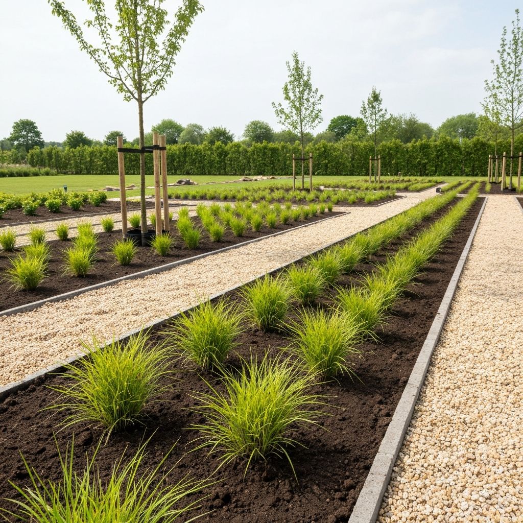 Het aanplanten en heraanplanten van perken in tuinen en industriezones, inclusief schorsen voor een verzorgd resultaat.